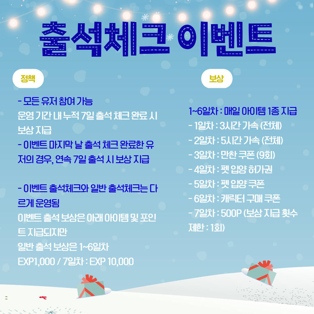 - 운영 기간 내 누적 7일 출석 체크 완료 시 보상 지급